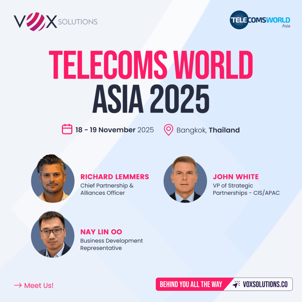We’re excited to announce that Vox Solutions will be participating in Telecoms World Asia 2025, taking place 18–19 November 2025 at Centara Grand & Bangkok Convention Centre at CentralWorld, Bangkok.