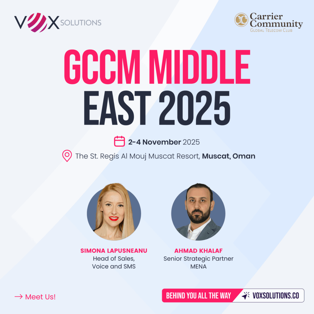 We’re excited to share that our colleagues, Ahmad Khalaf – Senior Strategic Partner on MENA, and Simona Lapusneanu – Head of Sales, Voice and SMS, will be attending GCCM Middle East by Carrier Community, taking place 2 – 4 November in Muscat, Oman.